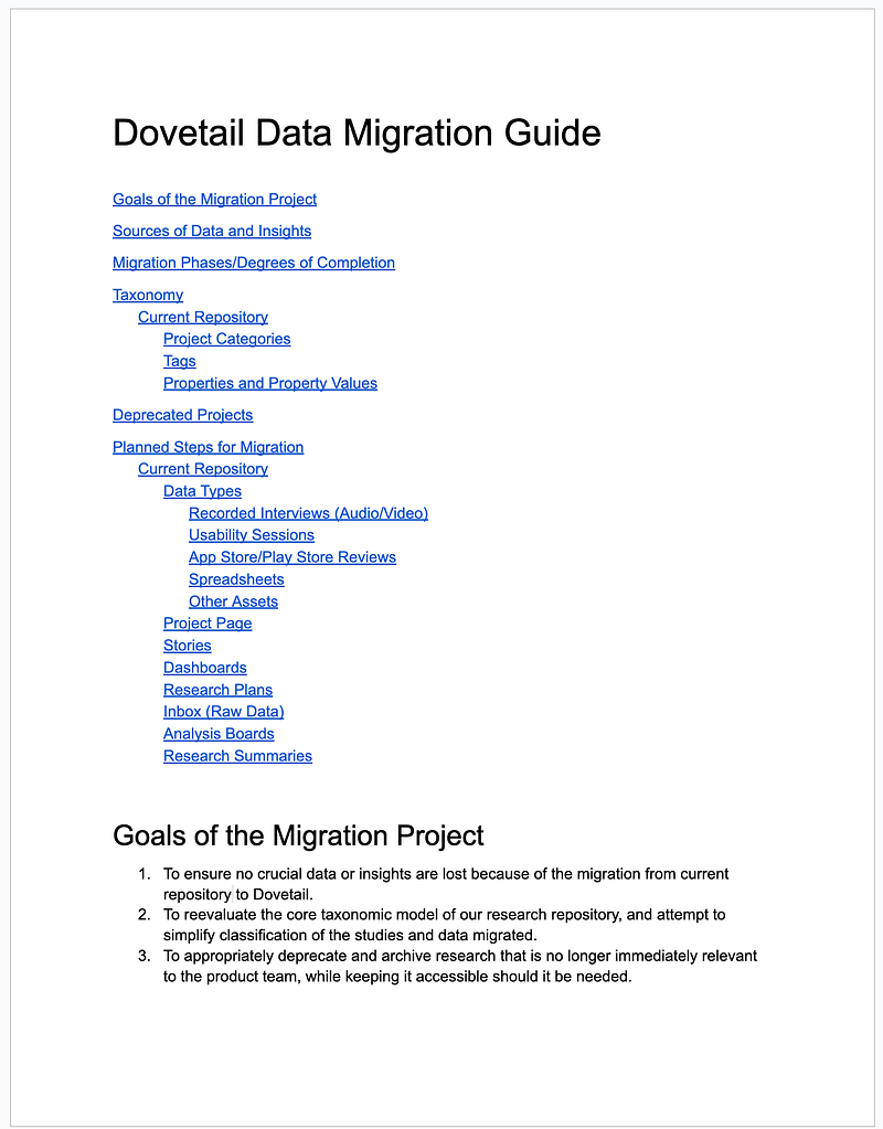 Working in a security-centric organization means that our procurement cycles are usually longer than other places. Although we quickly identified Dovetail as our new repository tool of choice, it would still take 3–4 months before we could begin the migration process in earnest. Given this constraint, it was crucial to make progress on more than one priority simultaneously. This meant working on tasks over which I had more direct control while waiting for security reviews, contract redlines, and signatures to be completed.